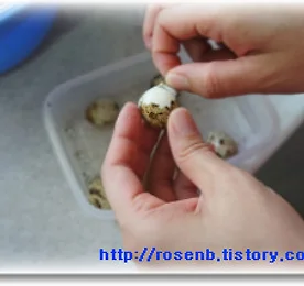 메추리알장조림 재료 : 메추리알 60개, 마늘, 간장 6Ts, 청주2Ts, 설탕2Ts, 물엿2Ts, 후추약간. 통깨 ▶ 요리법 1. 냄비에 물이 끓을때 소금을 넣고 메추리알을 삶아 줍니다. 2. 찬물에서 껍질을 벗기고 준비합니다. 3. 마늘을 편으로 썰어 줍니다. 4. 메추리알과 마늘, 물은 반컵정도 넣고, 간장, 청주, 물엿, 설탕, 후추를 넣고 약한불에 계속해서 조려줍니다. 5. 양념장이 거의 없어질때까지 조려주시고 통깨를 뿌려주면 완성~~!